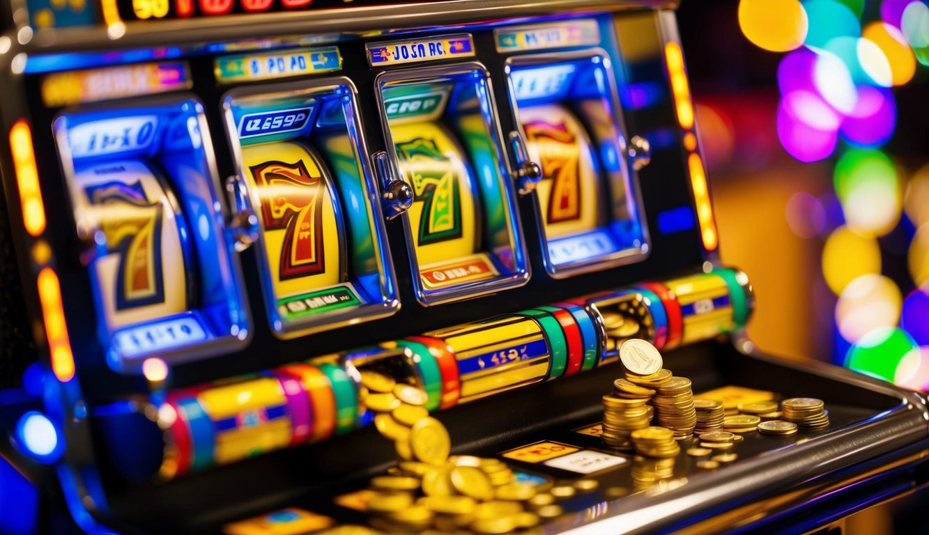Sebuah mesin slot yang berwarna-warni dan cerah dikelilingi oleh lampu berkedip dan koin yang mengalir keluar dari slot kemenangan
